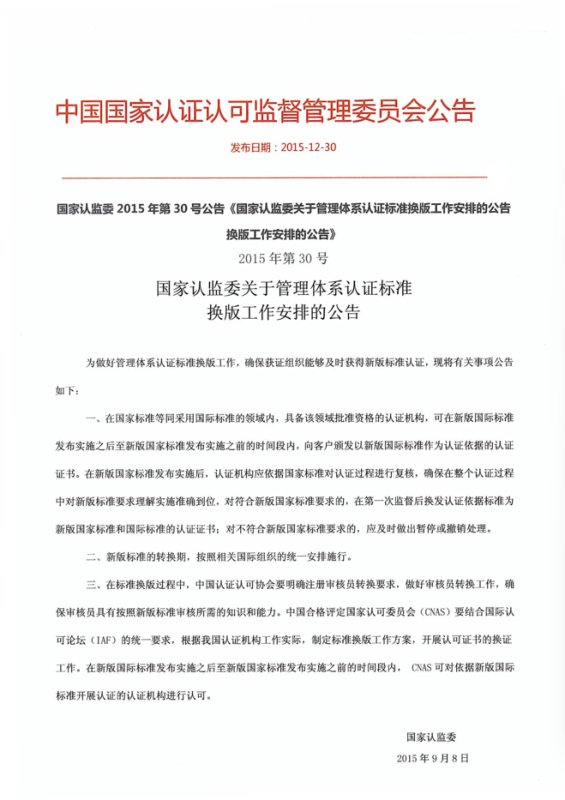 國(guó)家認(rèn)監(jiān)委2015年第30號(hào)公告《國(guó)家認(rèn)監(jiān)委關(guān)于管理體系認(rèn)證標(biāo)準(zhǔn)換版工作安排的公告換版工作安排的公告》